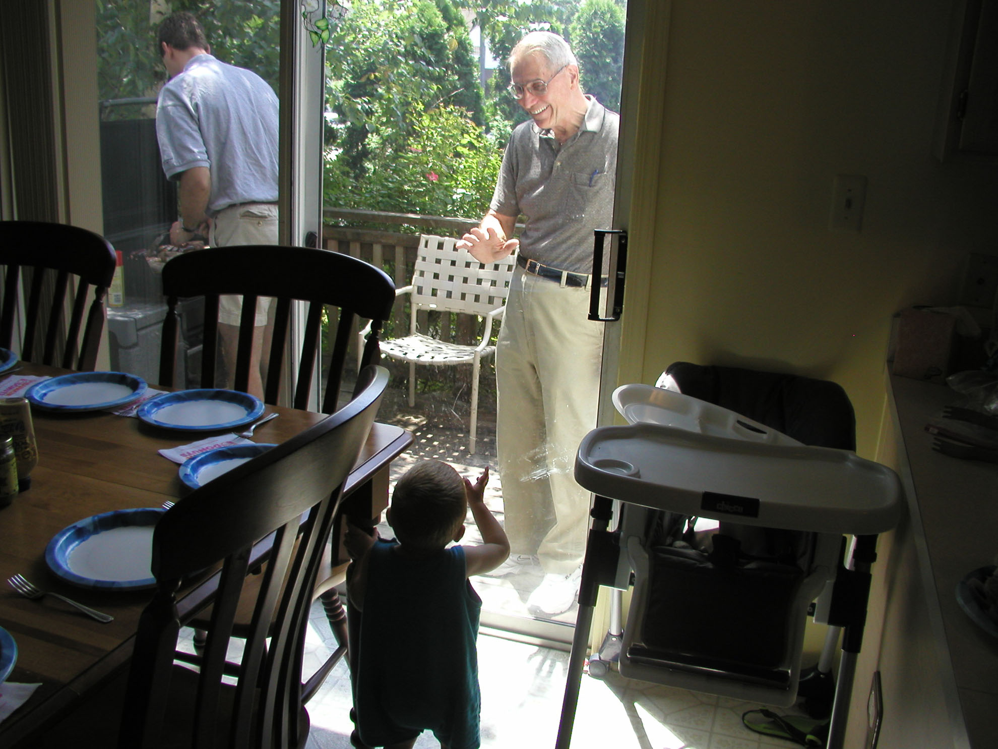 Seth waves hello to Dad while he is out on the back porch making sure the meat gets grilled to perfection.